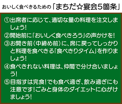 宴会5箇条では、【1】出席者に応じて適切な量を、【2】開始前に「おいしく食べきろう」と声掛け、【3】「食べきりタイム」の導入、【4】食べきれない料理は分け合う、【5】目指すは完食を提案している。