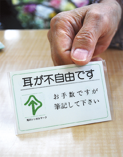「サイレンが聞こえずに逃げ遅れた」「避難場所で案内が流れているのに気が付かず、もらうべきものをもらえなかった」。災害時における聴覚障害者の体験談。市内在住で同じ障害(難聴)を持つ女性から話を聞いた。上記のような状況の際の対策として八王子市では、「メールやSNSで防災情報の発信」「避難所の防災倉庫に筆談に使えるメッセージボードの用意」などをしている。しかし、非常時に直面し、抱えた障害を周囲に伝えられないために危機に陥る人もいる。「『助けて』となかなか言えない。そういう人がいることも知ってもらいたい」と女性は切実に訴えった。*取材には要約筆記者が同行