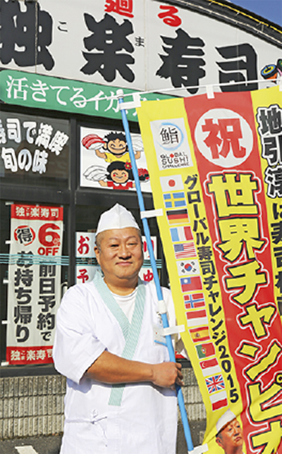 世界の寿司職人”すしシェフ”が技術を競いあう「グローバル寿司チャレンジ2015」(ノルウェー水産物審議会と国際すし知識認証協会)の決勝大会が昨年11月に都内で行われ、市内の回転寿司「独楽(こま)寿司」3店舗(楢原、八王子、めじろ台)を統括するブロック長の地引淳さん=人物風土記で紹介=が優勝した。