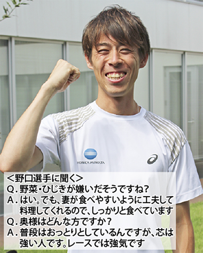 マラソンの下地づくりは市内で行ってきた。高尾山では、マラソンを走り切るための脚作りを行い、台町・富士森公園内の陸上競技場でスピードも強化を図ってきた。「高尾山には、登山者の方に迷惑がかからないように、早朝に登るなど工夫してきました。八王子は走力を高めるのに適している街」。今回の好成績には、今年3月に結婚した現役の実業団ランナーである妻の理沙さんの存在も大きい。朝早く起きて、野口選手のために栄養を考えた食事をつくってくれるなど、理沙さんの献身的なサポートが好走を支えた。「恩返し、したいという気持ちが力になりました」(理沙さんも今回のマラソンで女子の部3位の好成績を挙げた)