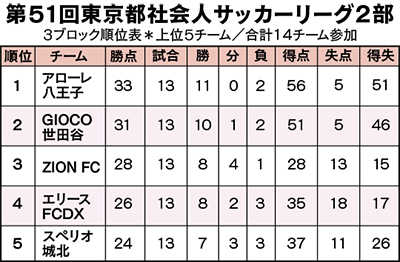 Jリーグ参入をめざす社会人サッカーチーム「アローレ八王子」(犬目町/紙本諭代表)は所属する都2部リーグで優勝し1部昇格を確実にした。