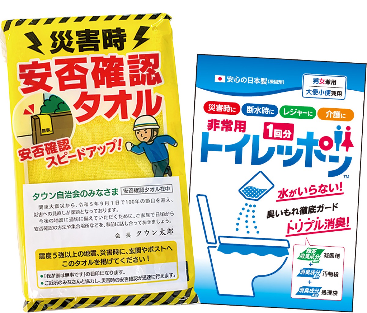 タウンニュース社では、防災ボトルや非常用簡易トイレ、給水バッグ、安否確認タオルなど注目の防災グッズを満載したカタログを、希望する町会・自治会等の代表者、または防災担当者に進呈中。掲載品の注文は電話で可能。各団体1回限定でサンプルも進呈。