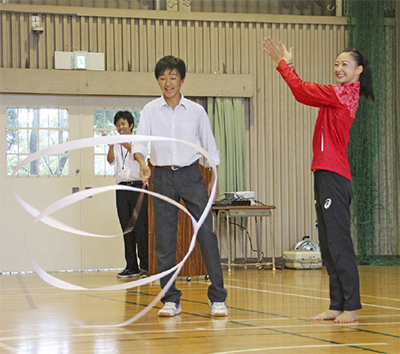 その後、リボンやクラブ、フープなどのデモンストレーションを行い、飛び入りで参加した生徒たちにコツなどを教えた。中には女子生徒が思わず「かわいい」と畠山さんに抱きつく場面も。生徒からの質疑応答では「体が硬いので柔らかくなる方法を」「緊張をほぐす秘訣は」といった質問に「毎日柔軟を」「リラックスできる方法を探すこと」などと笑顔で答えた。