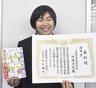 自分がお薦めする本を紹介し合い、聴衆がどの本を一番読みたくなったかを決める「ビブリオバトル」。各府県と首都圏の中学生たちが参加する「中学選抜ビブリオバトル東京大会」(活字文化推進会議主催)が3月29日、青山学院大学(渋谷区)で開催され、市立青陵中学校3年の阿部涼夏さん(14)が3位に輝いた。
