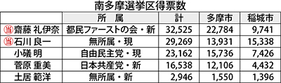南多摩選挙区では、午後10時過ぎに齋藤氏、石川氏に当確が出された。結果、トップ当選した齋藤氏は、3万2525票を獲得。石川氏は2万9269票を獲得し、3番目だった小礒氏との差は6107票だった。