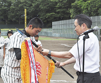 最終日に行われた順位決定戦では、大三連ネオナイン(大田区)、東光寺少年野球クラブ(日野市)、多摩倶楽部(多摩市)の総当たり戦が行われ、東光寺が優勝、大三連が2位、多摩倶楽部が3位という結果に終わった。閉会式では、今回から用意された優勝旗がトヨタ西東京カローラ(株)の舟橋竹彦代表取締役社長から優勝した東光寺少年野球クラブに贈られた=写真。