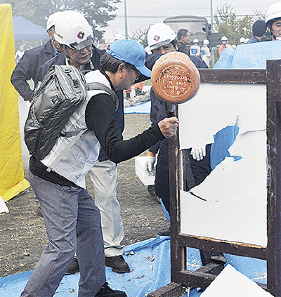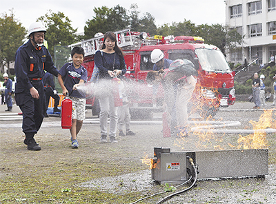 「多摩市総合防災訓練」が9月23日、市立東愛宕中学校をメーン会場に、約1200人が参加して行われた。同校の1年生をはじめ、地域住民や関係団体が模擬消火器による初期消火やポンプ車からの放水、救助資機材の取り扱い、各種搬送法の体験の他、炊き出しなどの訓練を体験。今年は、南多摩獣医師会、日本防災士会東京都支部多摩ブロックが初めて参加し、ペットの同行避難の方法についての周知・啓発、ロープワーク訓練も行われた。最後に行われた東京消防庁による高所からの救出・救助演習、多摩市消防団による一斉放水演習では、その迫力に見守った参加者から大きな歓声が沸いた。近隣の愛宕コミュニティセンターでは、二次避難所を想定した避難所設置・運営訓練も行われ、約70人が宿泊をしながら有事に備えて熱心に取り組んでいた。