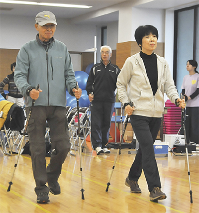 講習会は、全3回で行われ、初日となるこの日は、午前の部に23人、午後の部に19人が参加。NPO法人日本ノルディックウォーキング協会の指導のもと、ポールの持ち方などの説明を受けた後、実践にトレーニング室やキャンパス内をポールを使って歩いた。