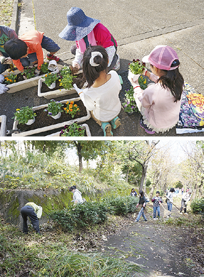 当日は、土をならしたプランターに花を植え、以前花壇だった正門前の空きスペースに並べたほか、草が伸びて子どもたちの視界を遮っていた南門の通学路の草刈りを行った。