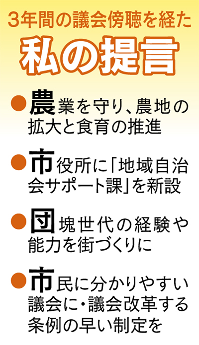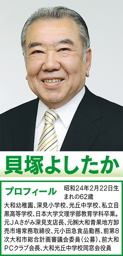 また今回、特に食の供給を確保することが、いかなる場合にも重要であると痛感し、農業を守り、農地の拡大を図ること等が必要です。私は以上の視点から、安心・安全で、一人でも多くの人々が幸せを感じることができる大和の街づくりにチャレンジいたします。