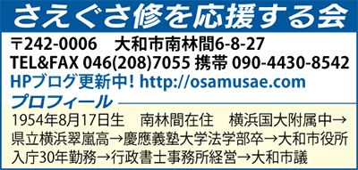 私、さえぐさ修は、大和市役所に30年間勤めた後、大和市議としてこの4年間、活動してまいりました。