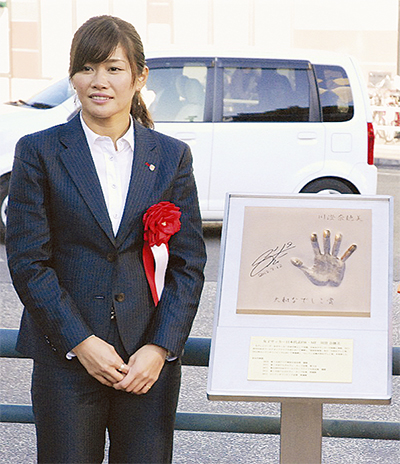式典であいさつした川澄選手は「まさか自分の手形がモニュメントになるとは思ってもみなかった。ぜひ皆さんも手を合わせてみてください」と笑顔で話していた。