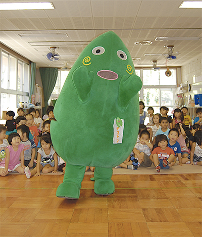 大和市イベントキャラクター・ヤマトンが2日、市立福田保育園を訪問し、65人の園児と触れ合いながら、現在開催中の「ゆるキャラグランプリ2014」への投票を呼びかけた。