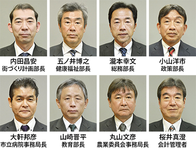 ▽金守孝次(政策部長)▽大矢貴志(健康福祉部長)▽金子正美(健康福祉部付担当部長)▽関信夫(こども部長)▽海老沢義行(街づくり計画部長)▽中田明(会計管理者)▽近藤行彦(選挙管理委員会事務局長)▽池田直人(市立病院事務局長)