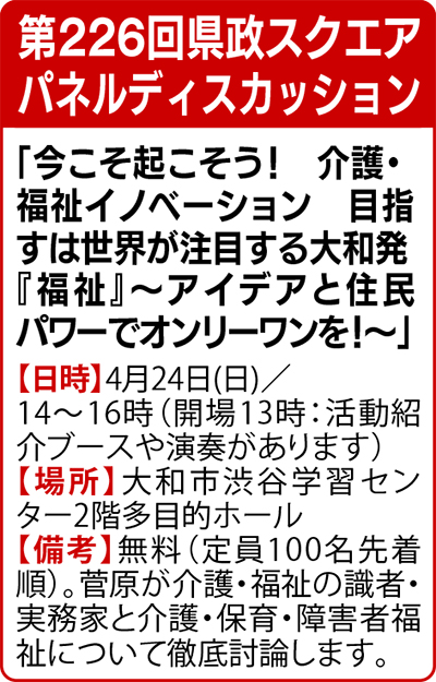 今回は、政策の3本柱である「介護・福祉」、「行財政改革・議会改革」及び「安全」について菅原直敏の活動の成果等についてご報告します。