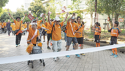 これは、市内をエリアごとに5グループに分け、介護・医療事業所などをつないで走るもの。当日は事業者・施設利用者・自治会など約140人のランナーが参加し、全グループのゴール地点・引地台公園を目指した。また、大和シルフィードU-15のメンバーやサックス奏者の北嶋恭子さんが応援に駆け付けた。