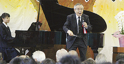 その後、同校の卒業生でノーベル化学賞を受賞した根岸英一さんが「自分が何をしたいのか、将来どういうことをすれば世の中の役に立つのか、そういう夢を持つ時」と生徒たちにエールを送り、校歌や「ふるさと」を一緒に歌った。
