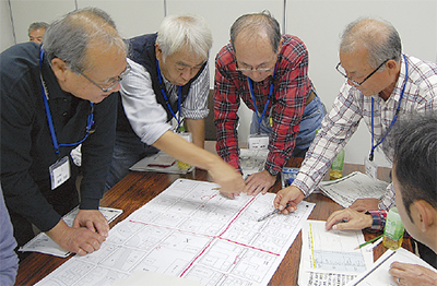 「災害図上訓練DIG」とは、災害発生時を想定し、白地図に情報をカラーペンで書き込みながら解決策を検討するワーク。今回は熊本地震と同規模の大地震を想定した。自治会長は5〜7人のグループに分かれ、講師を務めた静岡市危機管理総室対策グループの安本治之さんから時間ごとに次々と提示される「家屋倒壊で生き埋め」「火災発生」などの状況を聞き、地理や気象条件も考慮しながら自治会の対応を議論した。
