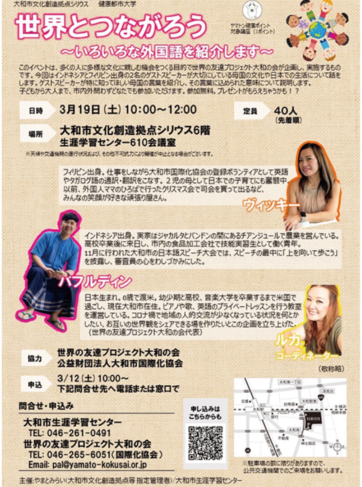 世界の友達プロジェクト大和の会(荒谷(あらや)留架(るか)代表=今号の人物風土記で紹介)が3月19日(土)、市文化創造拠点シリウスで「世界とつながろう〜いろいろな外国語を紹介します〜」を開く。
