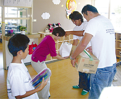 海老名市国分北の土木工事業者(有)堅昇土建のメンバーが市内の「えかきすと」佐々木みどりさんと、東日本大震災で被災した子どもたちに向けて製作した絵本を9日、宮城県東松島市の保育所に届けた。