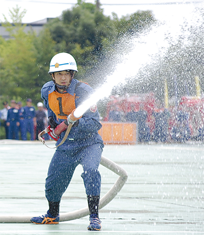 大会は厚木市内の県総合防災センター内で開かれ、多くの観客が見守る中、市消防署員や消防団OBが大勢駆けつけ、「がんばれ!」などと応援の声が飛び交った。選手はポンプ車で水をくみ上げ、53m先の火元に見立てた目標に放水。一連操作の技術や時間を競い合った。