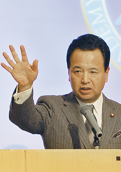 甘利明経済再生担当大臣が4月20日、海老名市内のホテルで講演し、安倍政権が進める経済政策「アベノミクス」について解説した。