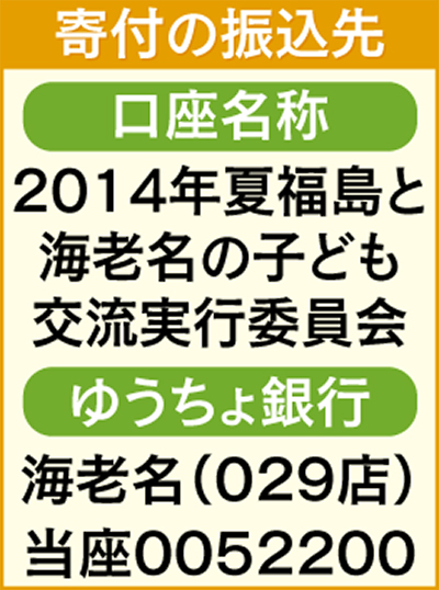 東日本大震災による津波被害や原発事故の影響を受けた福島県南相馬市の子どもたちを招待し、海老名市内の子どもたちと交流を深めるイベントを、市内に暮らす有志ら「2014年夏 福島と海老名の子ども交流実行委員会」(見上健一委員長)が企画中だ。