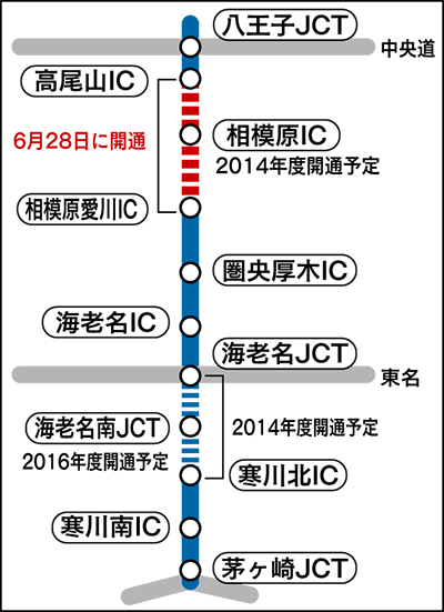 国土交通省関東地方整備局相武国道事務所などによると海老名ICから中央道に接続する八王子ジャンクション(JCT)までの所要時間は約20分。関越道の鶴ヶ島JCTまでは40分程度で到達できるようになるという。海老名ICから高尾山ICまでの通行料金は軽自動車860円、普通車1080円、中型車1290円、大型車1770円、特大車2960円。ETC利用時には深夜割引などが適用される。
