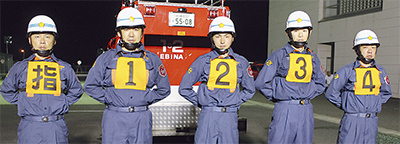 柳下分団長は「優勝を目指して頑張ります」と意気込んだ。出場メンバーは落合基道さん、日野智恵さん、清水昭典さん、井出直人さん、高澤真吾さん=写真。