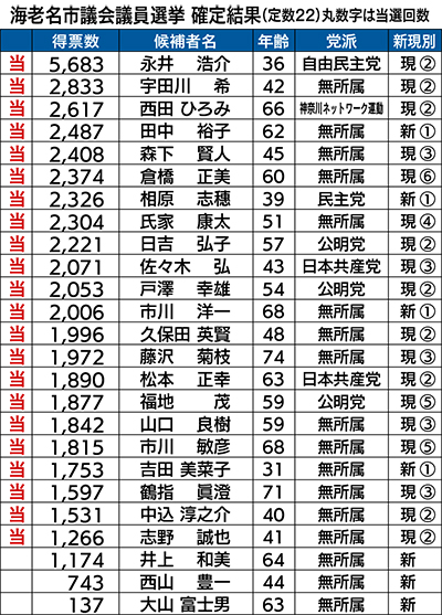 現職18人、新人7人が立候補した市議会議員選挙(定数22人)は国分寺台在住の現職市議・永井浩介氏(自民党・36歳)が5683票を獲得し4年前に続き2期目もトップ当選を果たした。また、2番目に票を獲得した宇田川希氏の2833票とも大差をつけた。