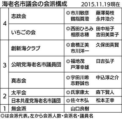 11月15日に行われた海老名市議会議員選挙(定数22)で議員の顔ぶれが決まった事を受け、市議会派の構成が19日に決まった。