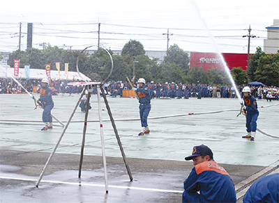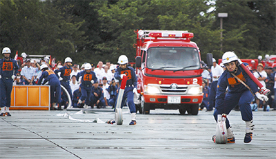 隔年開催される同大会。ポンプ車操法は、放水ホースを延長して標的を倒すまでの時間や、各隊員の行動の正確さ、迅速性、規律、士気の高さが審査される。