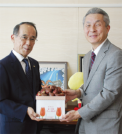 オークラフロンティアホテル海老名(桑原大治総支配人)が11月6日、市役所を訪れ、「オークラチューリップ」の球根を内野優市長に手渡した。