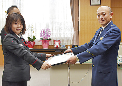 表彰を受け、頼住さんは「いつも通り対処しました。防止できてよかったです」とコメント。米川署長は「1件でも少なくしようと手を打っているので、今回のような対応は大変ありがたい。今後も金融・行政・市民・警察が連携して詐欺を防止していきたい」と語った。