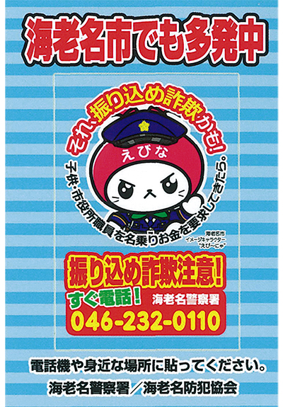 海老名警察署(米川僚一署長)はこのほど、近年増加する振り込め詐欺被害を未然に防ごうと、注意喚起を呼び掛ける「シール」を製作した。