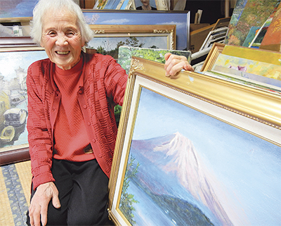 明治44年生まれ。孫、曾孫は17人にのぼる。昨年末に99歳を迎え、「白寿の記念に個展をやってはどうか」と絵画仲間に勧められた。一緒に暮らす娘の洋子さん(73)の後押しもあって、初となる個展の開催を決めた。作品展では富士山を描いた作品を中心に、40点ほどの油彩画を展示する。