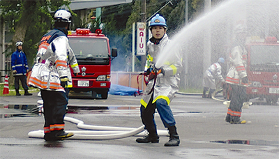 火災防御訓練は現場での資器材の取扱い、団員間の連携の向上を目的としている。毎分2千リットル以上を放水できるポンプ車と、毎分500リットル以上を放水する小型ポンプを使い、消火活動を行う。団員の士気を上げ、目標意識を持ってもらおうと、最優秀の部を決めるようになった。5分という規定タイムのなかで、現場指揮本部への報告から放水完了までの正確性や素早さを競う。