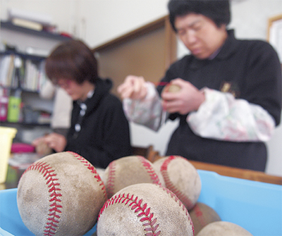 事務所の一室で、利用者たちが真剣な面持ちで、針と土色に染まった硬球を手に黙々と作業を行っている。1個のボールを再生するのにかかる時間は20分から1時間ほど。手作業でボールのほつれた部分を縫い直し、金づちで形を整えていく。「糸がうまくボールの穴に入らないことがある。そんな時は少し大変です」と、利用者の1人は表情を崩さずに答えた。