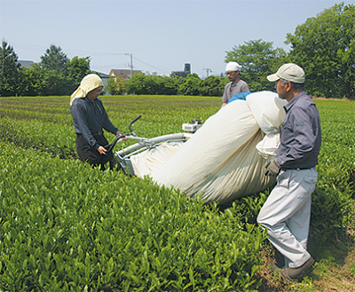 今月9日、海老名との市境、南栗原6丁目の畑に茶摘み機のエンジン音が響いた。真剣な面持ちで茶葉を見つめるのは、海老名市で不動産業を営む加藤修一郎さん。本業の側ら、7年間手をかけ続けた茶が初めて消費者のもとに届くとあり、作業にも自然と力が入る。摘み取り作業は3人がかりで行われ、1時間半ほどで終了。収穫された92kgの茶葉は、その日のうちに工場へと送られた。