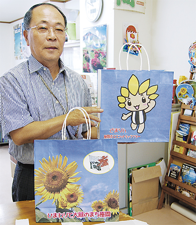 座間市観光協会(星野勝司会長)が市のマスコットキャラクター「ざまりん」と、座間市の名物であるひまわりと大凧をあしらった紙袋を作成し、市内商店への販売を開始した。