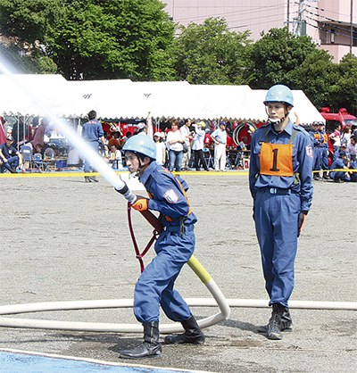 団員の士気高揚などを目的に隔年で行われている大会。両部門とも、ポンプを延長して放水する競技。標的を倒すまでの時間や技術、正確性が審査される。今大会には、各部門8チームが出場した。