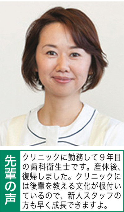 変更は、同クリニックが進める「予防歯科」とも深い関係にある。予防歯科とは、「歯科医院とは痛くなる前に通う場所」と考えるもので、欧州で浸透しているスタイル。予防において、大きな役割を担うのが歯科衛生士だ。歯科医師や歯科助手と対等なチーム関係で、患者の治療にあたる。それだけ知識と技術を習得できる他、先輩衛生士による指導もあり、安心して就業できる。募集要項は左記。