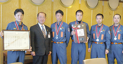 各都道府県代表の消防団が操法技術を競い合った「第24回全国消防操法大会」で、初出場ながら準優勝に輝いた座間市消防団が11月18日に市役所を訪れ、遠藤三紀夫市長に準優勝を報告した。