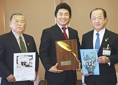 1232点の出品があった「世界らん展2015」の審査部門で、最上位となる日本大賞を「スピリット オブ ザマ」で受賞した加藤春幸さん(35/栗原)が今月2日、市役所を訪れ、「世界一」を遠藤三紀夫市長に報告した。