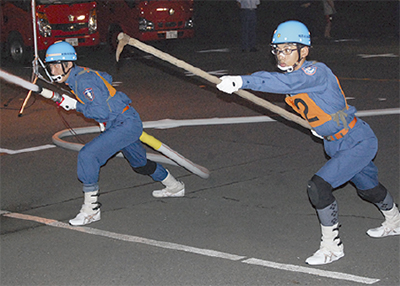 大会に向け、昨年10月末から始動している同分団。消防本部職員から指導を受け、優勝を狙える40秒台前半の記録を出せるようになってきているという。5日もスピード感溢れる操法を見せ、集まった来賓から拍手が送られていた。