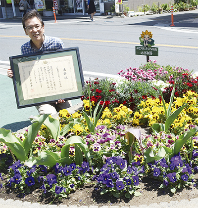 さがみ野駅北口で「花いっぱいのまち」をめざす「さがみ野やすらぎ街づくり委員会」(関吉実治会長)がこのほど、緑化推進運動功労者として内閣総理大臣から表彰を受けた。花壇の維持管理を里親に託し、地域企業がスポンサーとして花苗を提供する体制などが評価され、関吉会長は「里親やボランティアの皆さんと一緒に喜びたい」と話している。