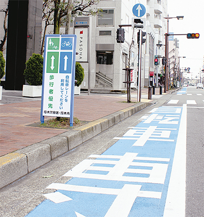 中心市街地での自転車事故対策として、厚木市内に初めて自転車専用レーンが整備される。専用レーンは、本厚木駅南口の市道本厚木停車場旭町線の同駅交差点から旭町5丁目交差点までの全長460mで供用開始は3月末を予定している。事業費は約1千万円。