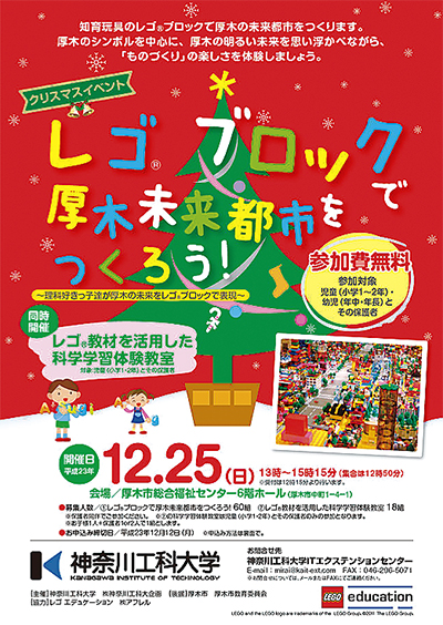 クリスマスイベント「レゴ®ブロックで厚木未来都市をつくろう!-理科好きっ子達が厚木の未来をレゴ®ブロックで実現-」が12月25日(日)、厚木市総合福祉センター6階ホールで行われる。時間は午後1時から3時15分まで。(主催/神奈川工科大学・(株)神奈川工科大企画)