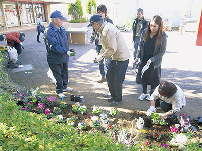 東京工芸大学の学生と鳶尾団地内の住民らによる花の植栽が、このほど同団地内の広場であった。