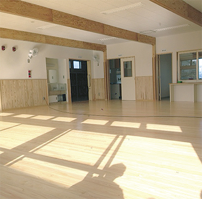 新しい児童館はこれまでと同じく木造平屋建てで、建築面積は従来のものよりやや狭い256・71平方メートル。建築にあたり、柱等には可能な限りスギを使用。また、土台と遊戯室のフローリングにはヒノキを使い、県産木材使用率は基準を上回る70%ほどとなった。